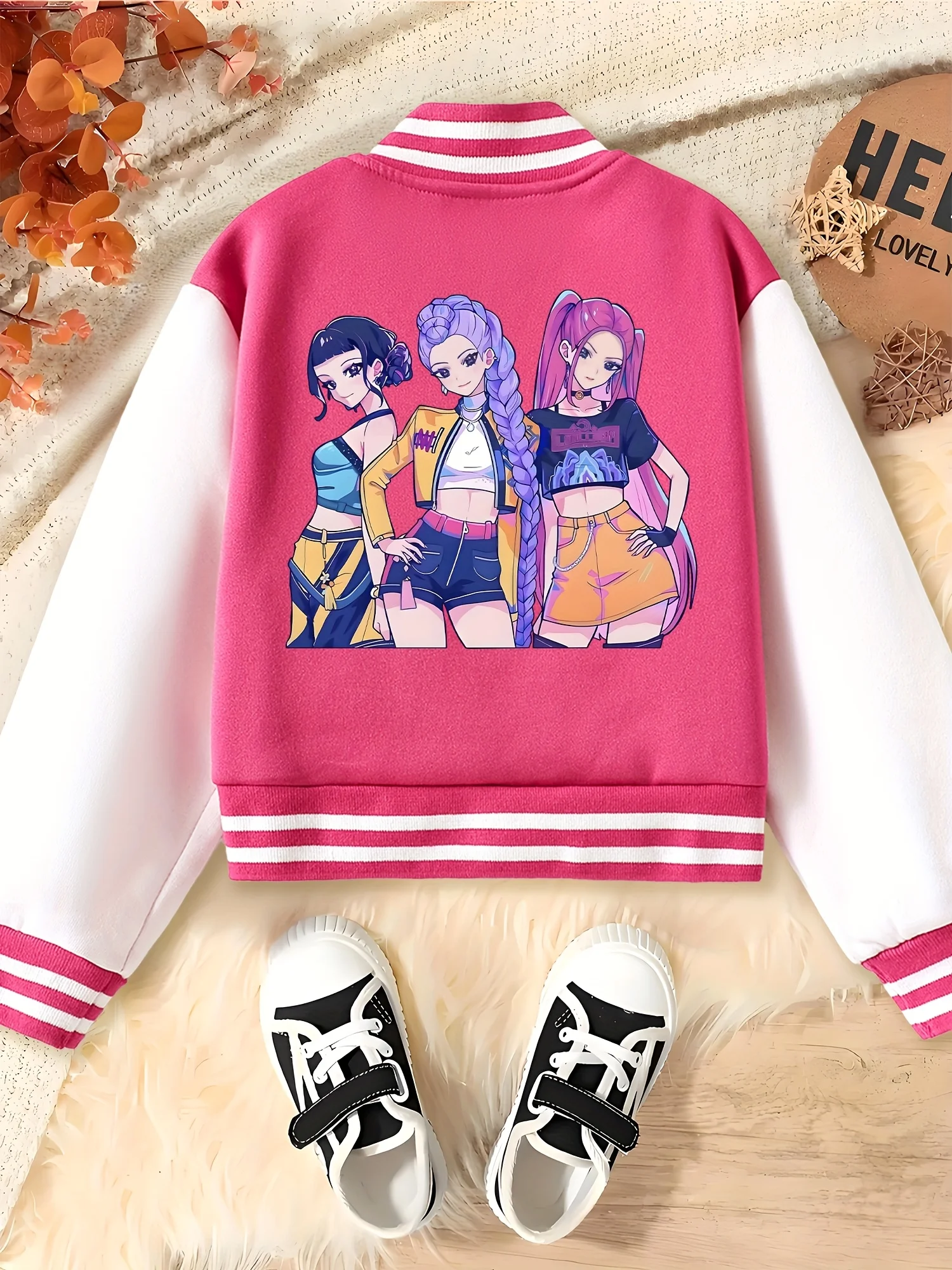 Christmas-Themed Short Baseball Jacket for Girls with a "Anime Idol Girl Group" Design, Trendy Clothing for Girls, Sportswear for Older Children, Casual Wear for Home and Outings, Versatile