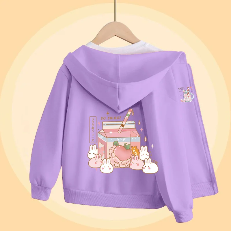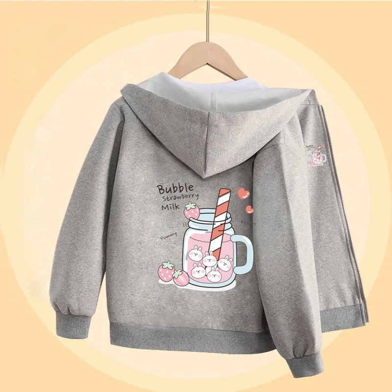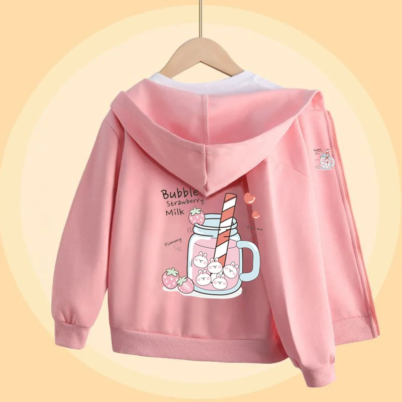 Girls Bubble Tea Cartoon Sweater Autumn Long Sleeved Coats with Zipper Pink Cute Hoodies 5-14T