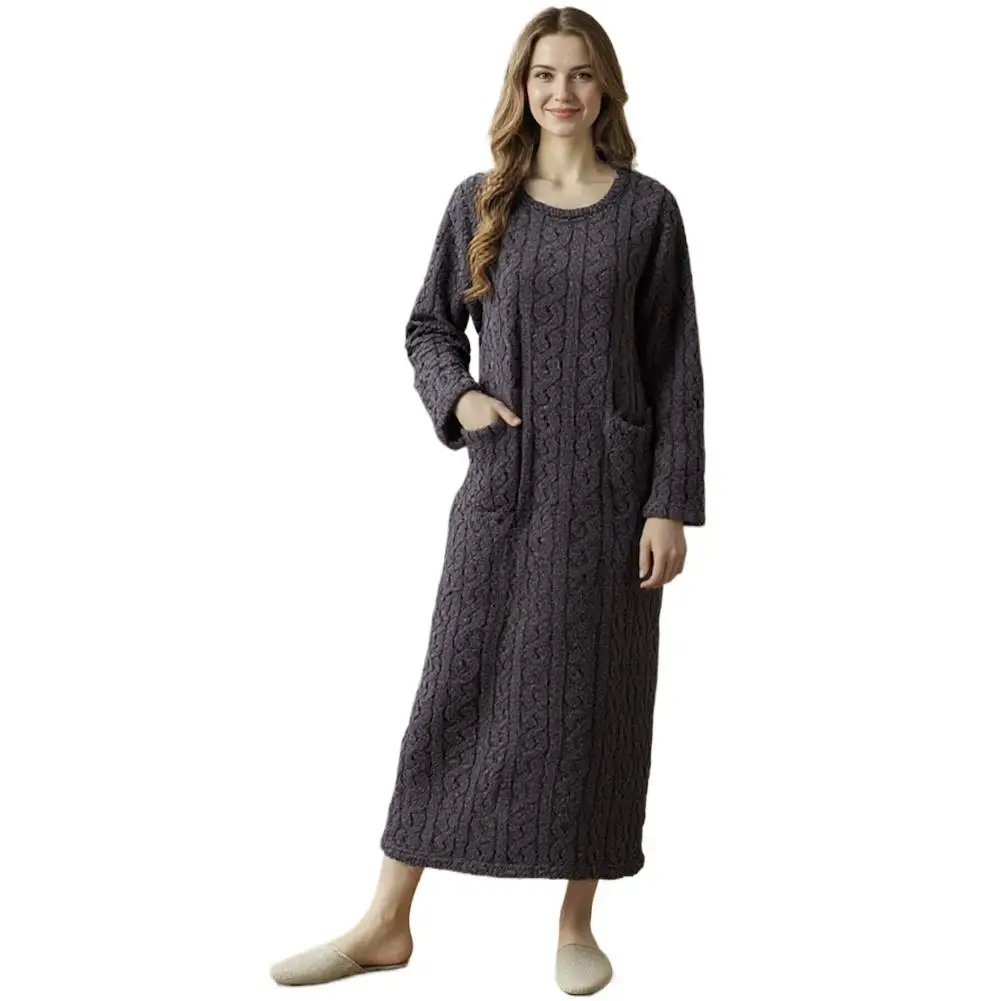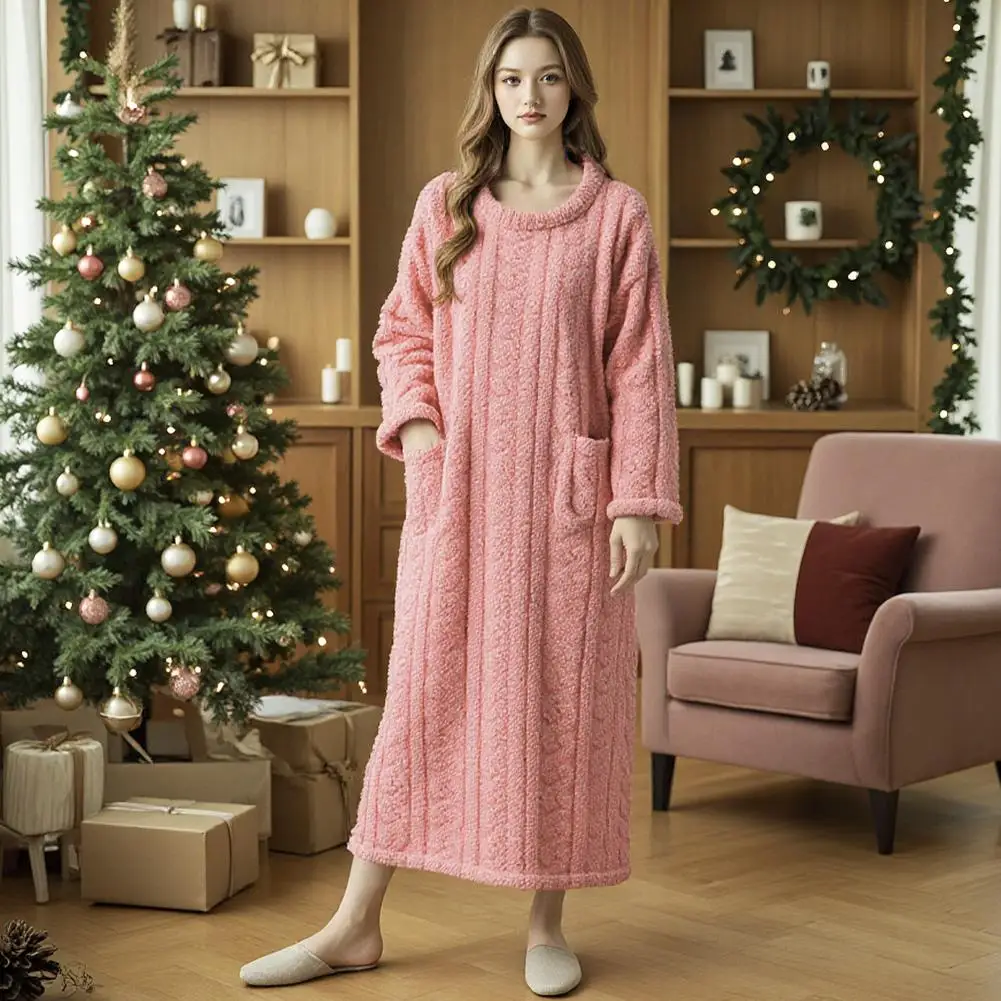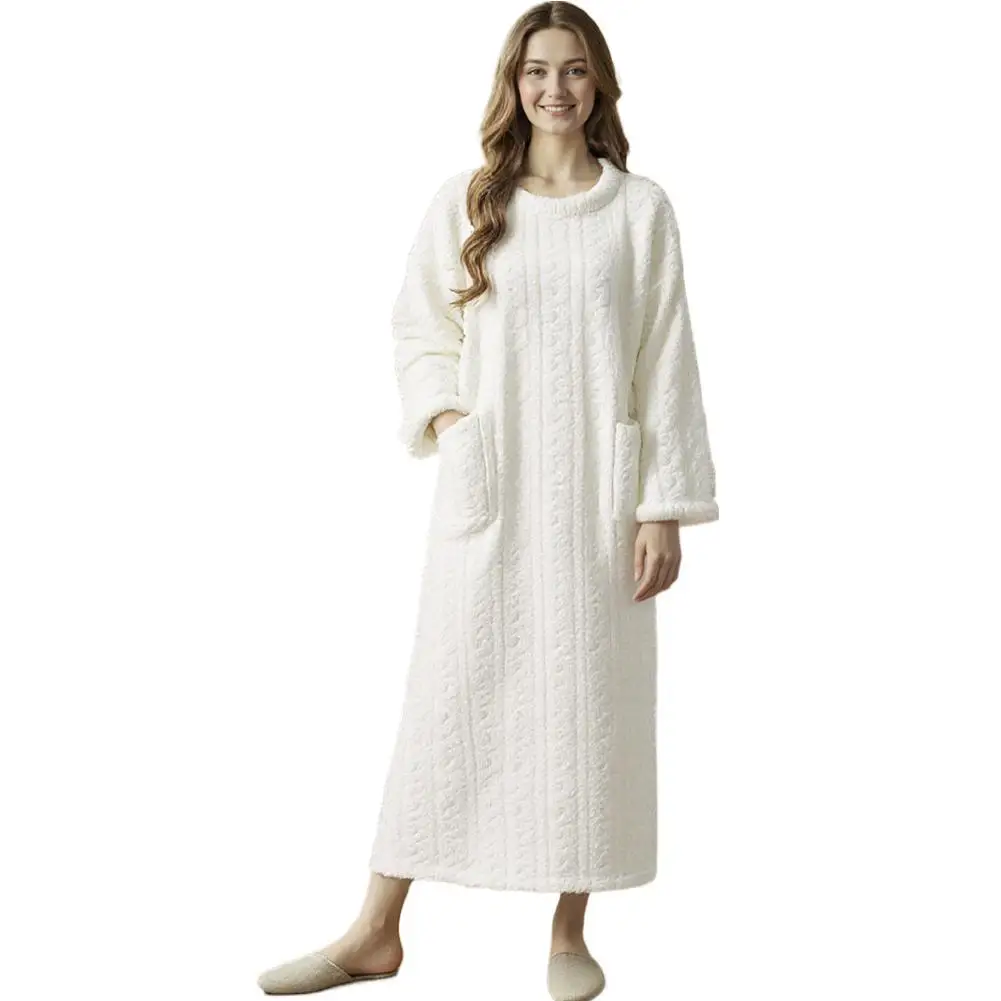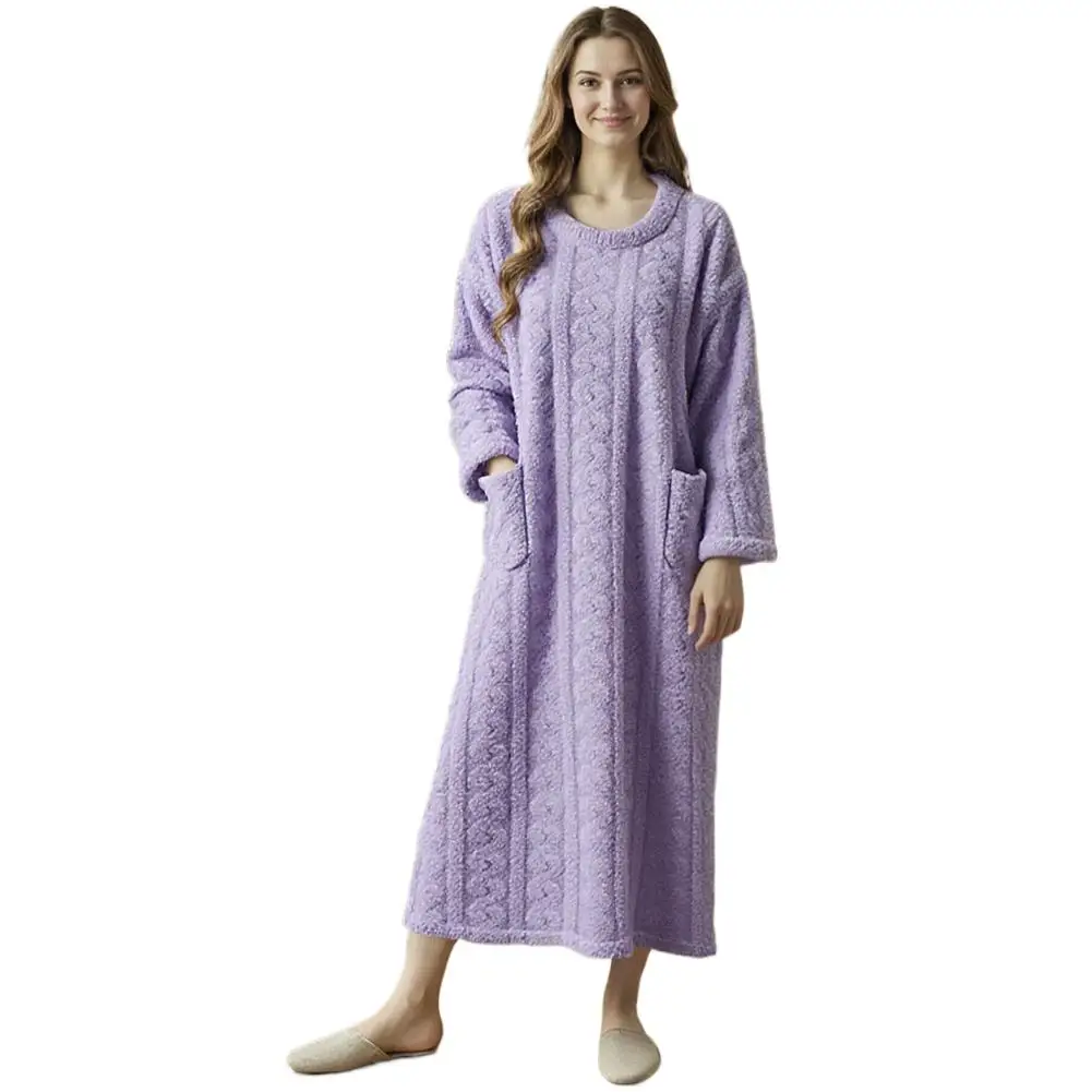 Winter Long Sleeve Double Pocket Flannel Nightgowns Women Loose Solid Sleepwear Jacquard Night Dress Thickened Warm Nightdress