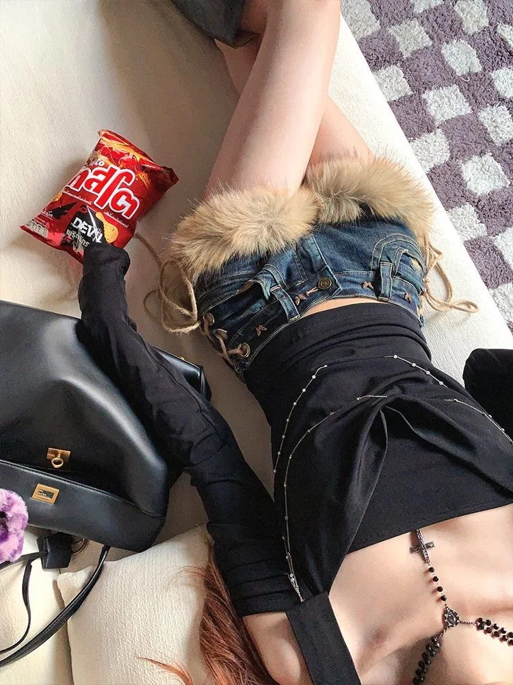 Winter New Women's Retro Design Fluffy Splicing Jeans Shorts Y2k Low-rise Strap Slim Hot Pants